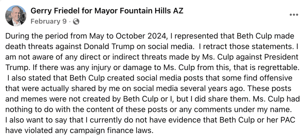 The lawsuit, brought against Friedel solely in his individual capacity, was based on social media posts, published on his personal Facebook pages. In these posts Friedel falsely and repeatedly accused a resident of committing a federal crime. Friedel also falsely accused the resident of impersonating him on social media and publishing crude and offensive posts under his name.