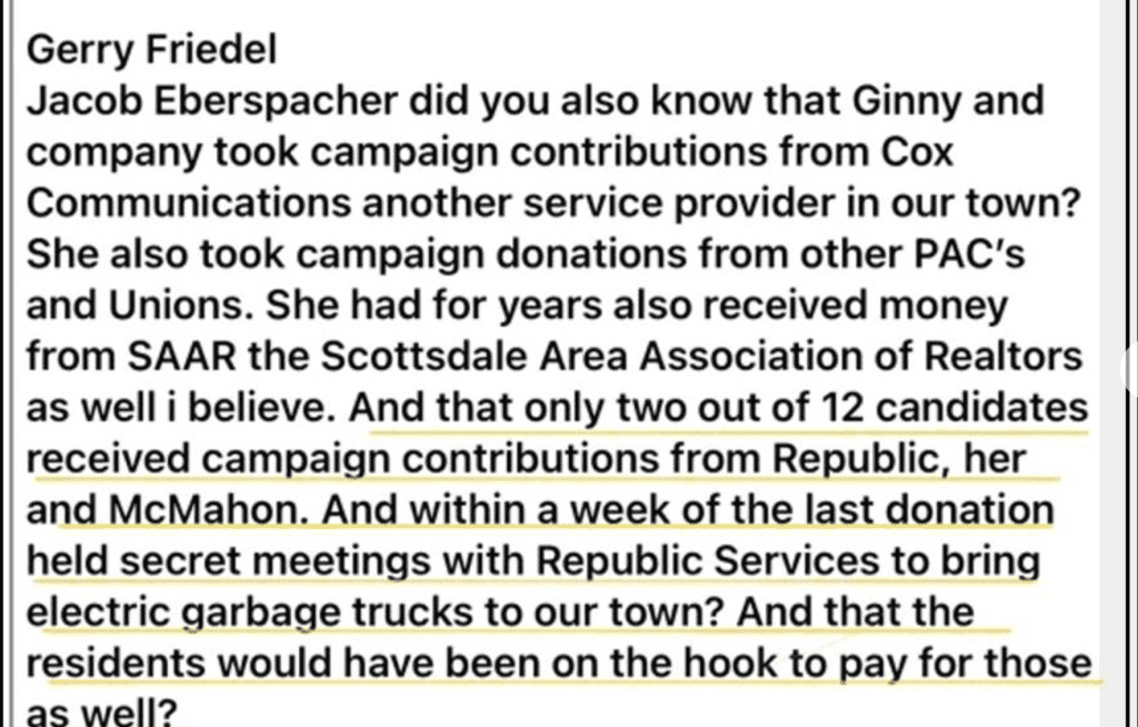 In his recent post that went beyond suggesting that Mayor Dickey was conspiring with Republic Services, he accused her and Peggy McMahon of accepting a bribe by claiming that within a week of accepting the last donation secret meetings were held to “bring electric garbage trucks to Fountain Hills” that “residents would have been on the hook to pay for.”
